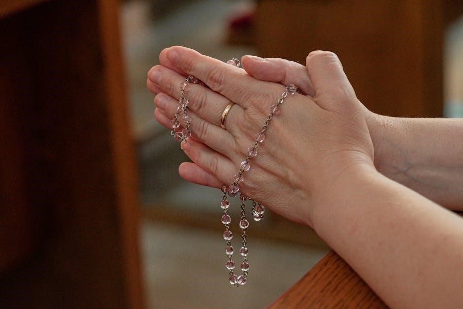 Many Catholics utilize PDF versions of the Rosary‚ easily accessible online‚ to facilitate this practice‚ especially during times of grief or memorial observances. Each decade‚ accompanied by the Hail Mary and Glory Be‚ is offered as a petition for the departed’s peace and eventual entry into Heaven.