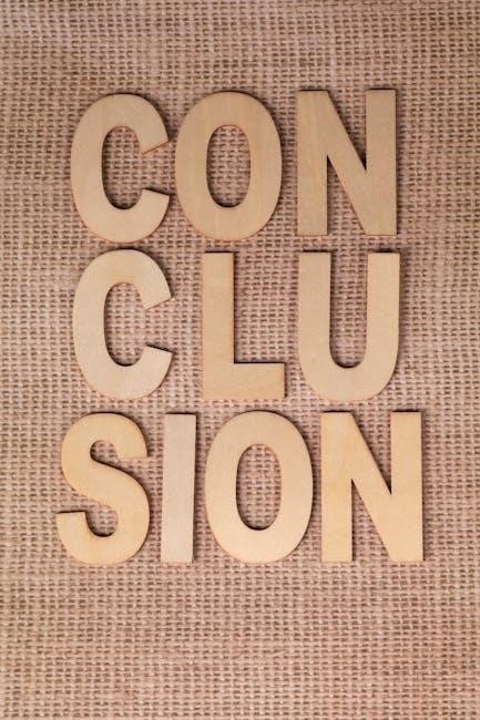 A PDF conclusion effectively summarizes key discussion points, typically appearing at the document’s end; it synthesizes information, offering a concise overview of presented ideas.